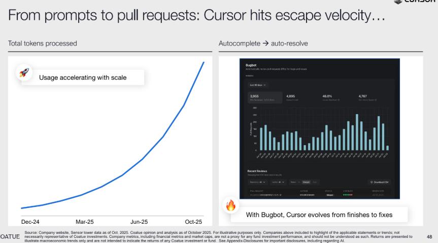 以 coding 领域为例,AI 的应用深度已从 “提示生成” 迈向 “全流程自动化”。Cursor 的 token 处理量随规模呈爆发式增长,其新功能 Bugbot 更是实现了代码漏洞的 “自动检测 + 自动修复”——AI 不仅能识别缺陷,还能实时修复,成为程序员的 “实时安全管家”。