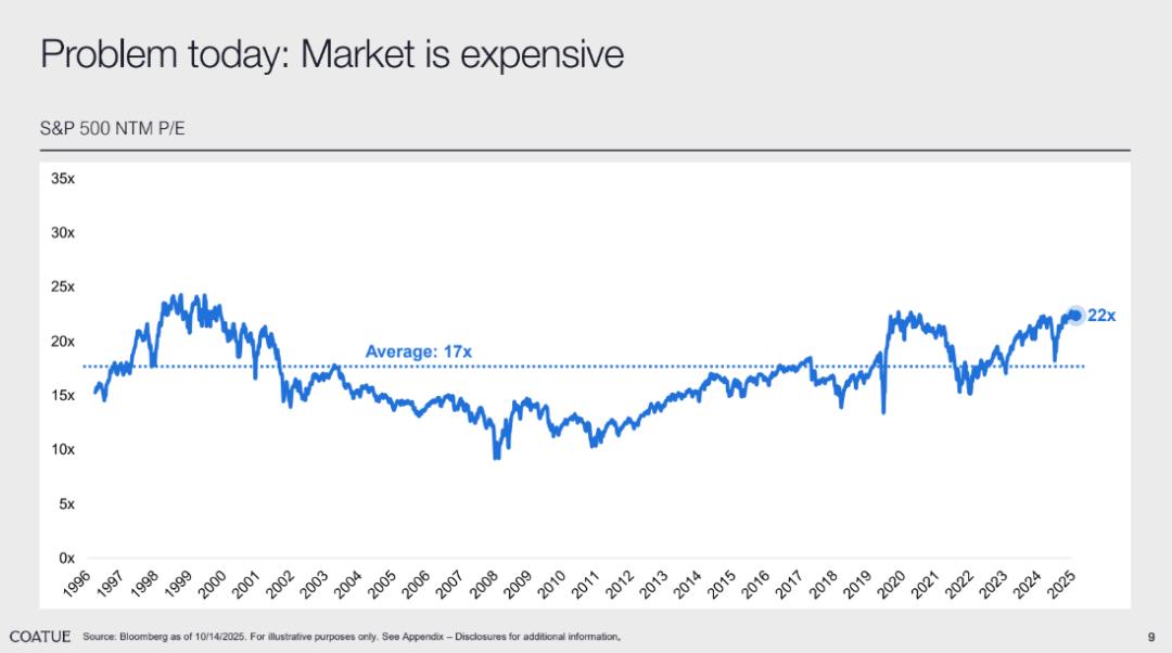 今天市场普遍担心当前 AI 领域的企业估值过高,存在过度炒作。这一观点的核心论据是:当前的 S&P 500 指数估值已处于历史高位区间。从 30 年的长期视角看,S&P 500 指数未来预期市盈率(NTM P/E)当前达到 22x,但历史均值仅为 17 倍,20 世纪 90 年代末的高点也不过 25x 左右。这一数字直观体现了市场整体的 “昂贵” 属性。