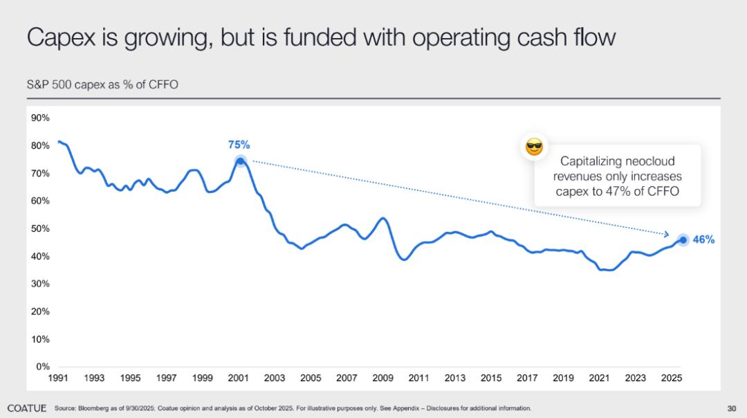 从下图可以看到,互联网泡沫时期(2000 年左右)CapEx 占经营现金流的比例为 75% ,而在这前 10 年中,CapEx 占经营现金流的比例甚至达到过 80%,而当前这一比例仅为 46%,远低于当年的水位。