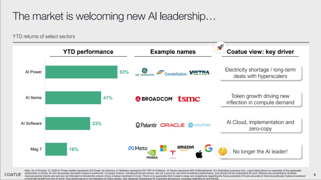 2. 大主题并不意味着相同的投资逻辑(Big themes ≠ same ideas),AI 等宏大叙事在不同阶段会孕育不同的受益者,作为投资者必须敏锐捕捉结构性转移机会;