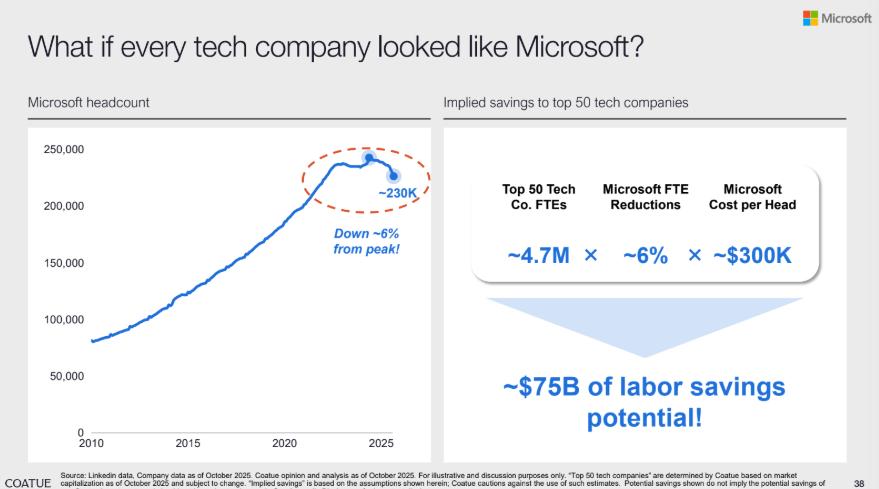 在成本节约的间接效用上,微软通过 AI 驱动的人力优化,员工数量从峰值下降约 6%,假如头部 50 家科技公司都可以实现这一成本优化水平,对应的是潜在可节省~750 亿美元人力成本。