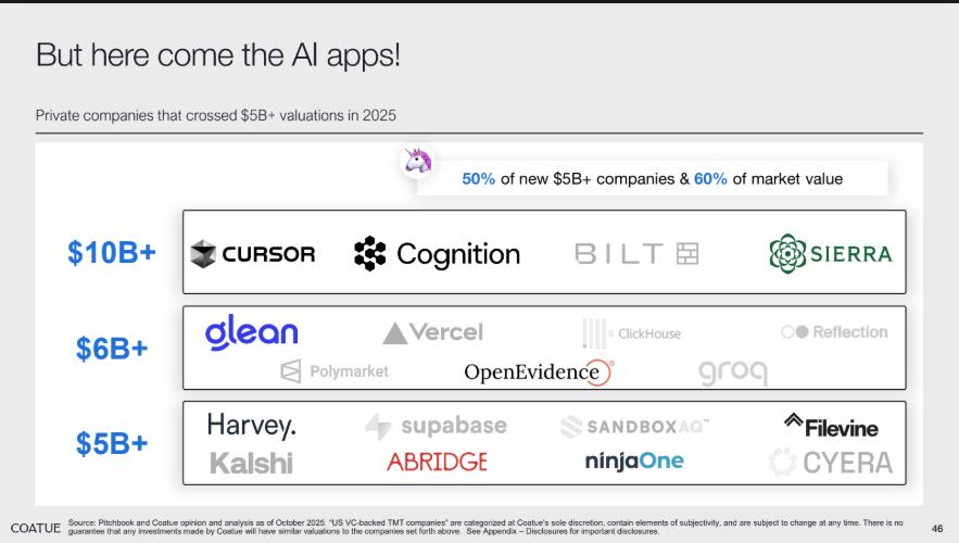 尽管基础设施是当前价值重心,AI 应用层的崛起也已进入规模化阶段。2025 年,Cursor、Cognition、BILT 等一批 private AI 应用公司估值突破 50 亿美元,50% 的新 “50 亿 + 估值俱乐部” 成员和 60% 的市值由 AI 应用贡献,标志着应用层创新从单点突破走向批量涌现。