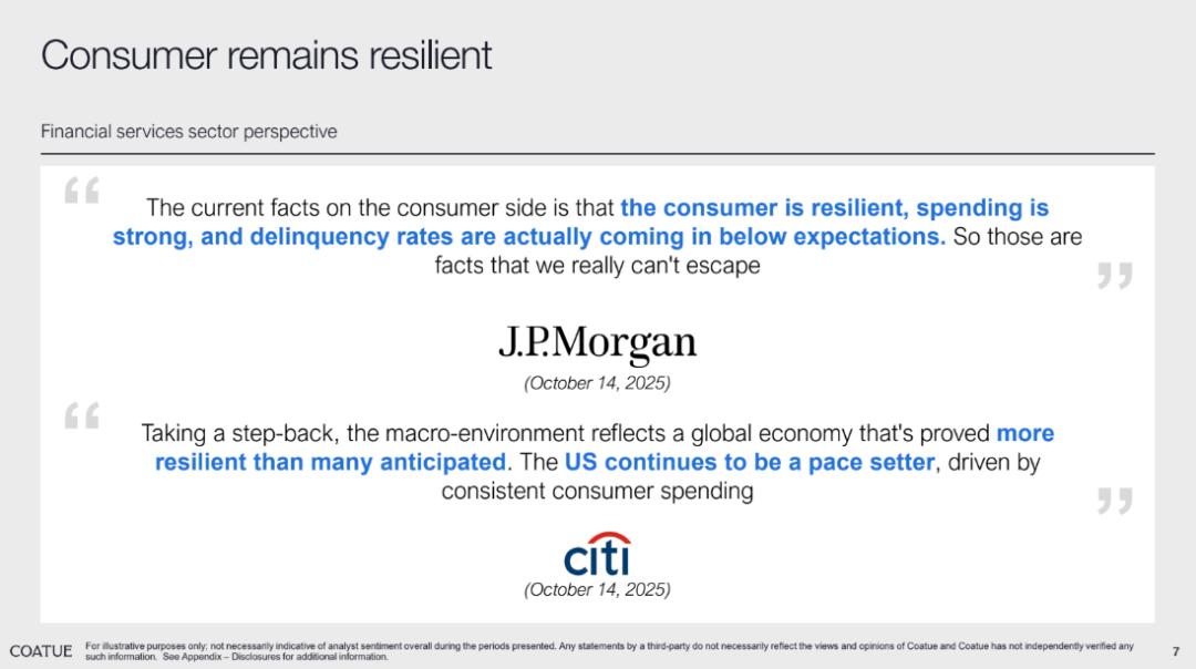 除了从市场宏观角度进行对比,Coate 在报告里还引用了J.P.Morgan 和 Citi 在本月中的两篇报告,从终端消费者角度进行说明 AI monmetum 的持续性。总体来看,强劲的消费基础缓解了市场对经济衰退的担忧,也为企业盈利和金融资产提供了重要支撑。