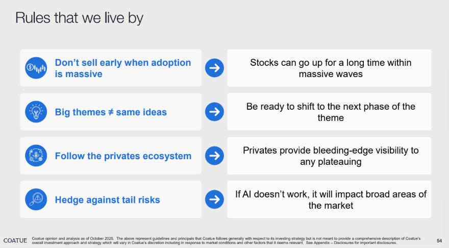 Coatue 也总结了在科技与 AI 周期中长期验证有效的四条核心投资原则: