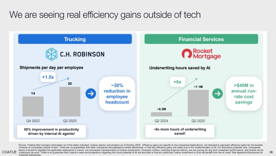 •货运公司 C.H.Robinson 依靠内部 AI agent 把员工单日货运处理量提升 1.5 倍,员工数量减少约 30%;