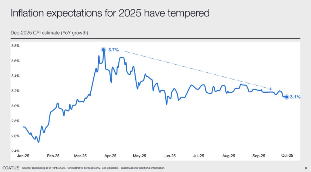 Coatue 通过数据分析指出,这种担忧已明显缓解。近半年来,全球通胀预期呈逐步下行趋势,Dec-2025 CPI 预估从 4 月 3.7%的高点一路降至 10 月的 3.1%。