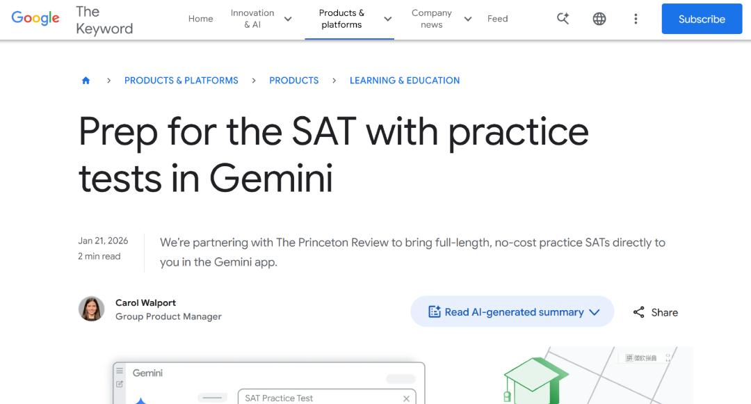 从平台策略上看,Gemini 并不是把一个解题能力「附加」到教育场景,而是把备考流程中最关键的训练节点直接下沉到免费层。谷歌近年来持续推动 Gemini 进入学习与教育相关场景,其目标更接近于把学习支持变成平台的基础能力之一。SAT 练习只是一个典型切口,因为标准化考试天然具备规模化复制的条件。