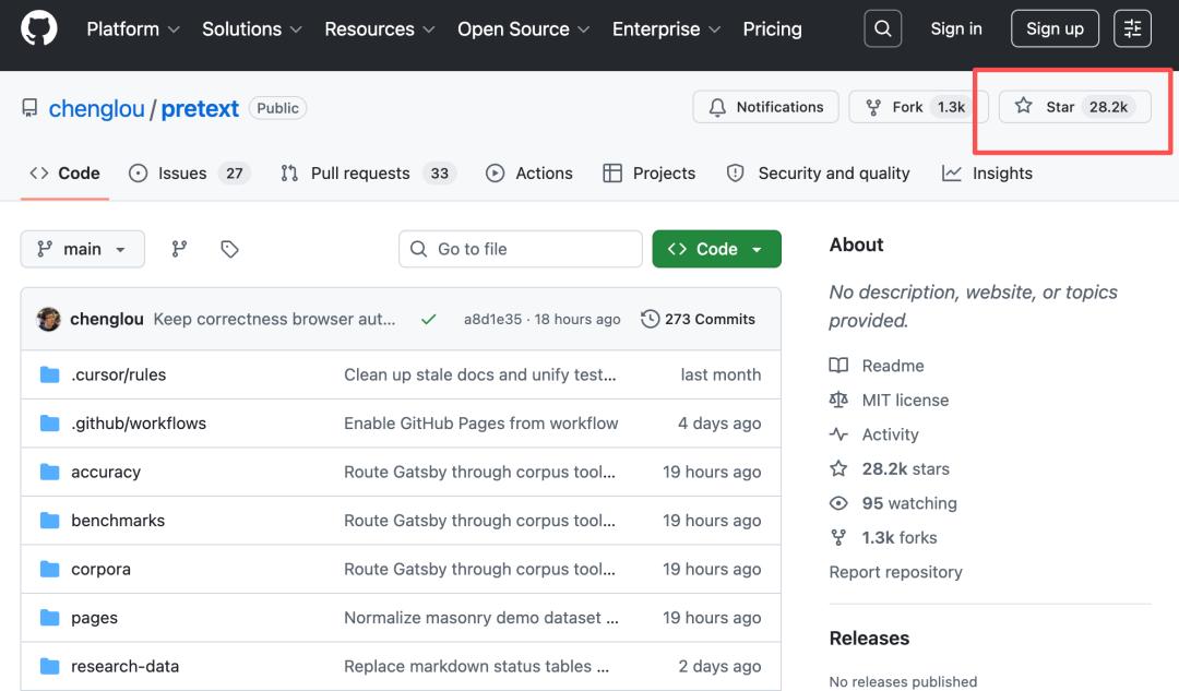 智东西4月1日消息,上个周末,前端大神的开源项目Pretext迅速引爆GitHub,至今Star数已飙升至2.82万,开发者的官宣推文浏览量已超2100万次,成为全球开发者社区焦点。