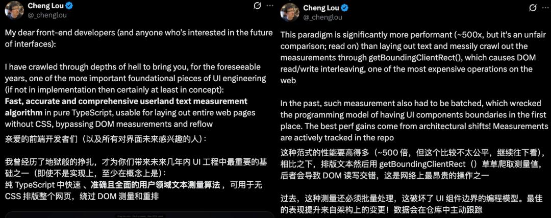 Cheng Lou在社交平台X上对Pretext给出了极高评价:“未来几年UI工程领域最重要的基础组件之一。”