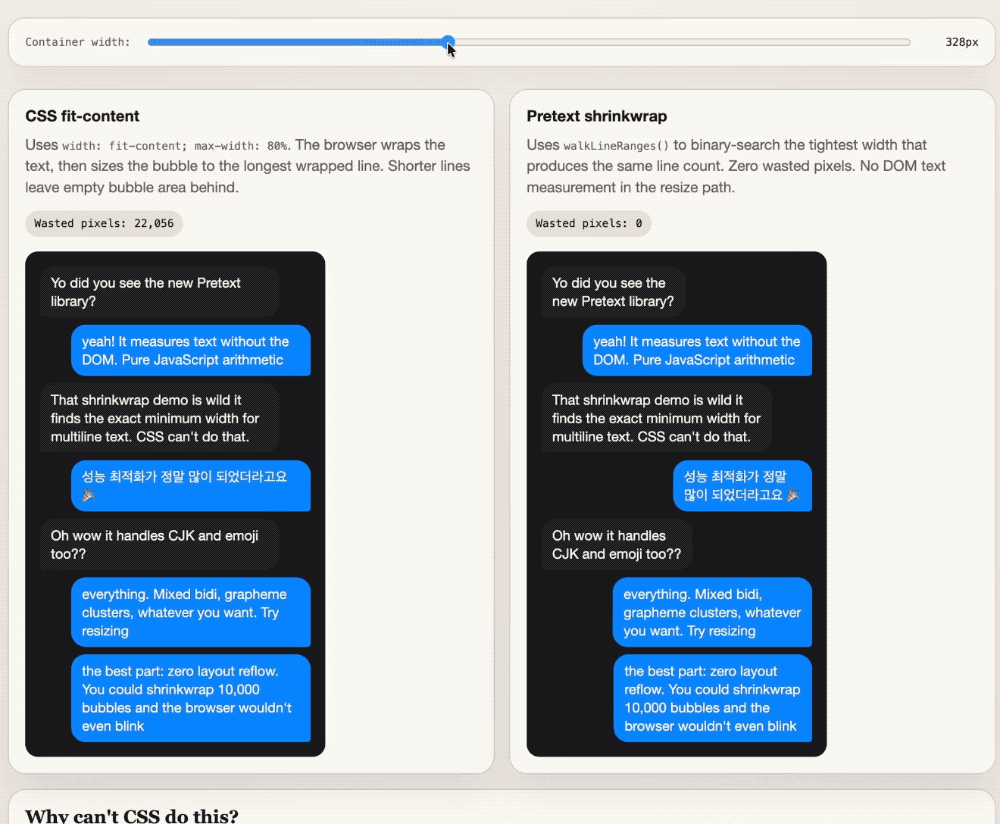 Pretext还支持开发者所能想到的所有语言,兼容各种浏览器特性差异。不过他也提到Pretext比传统方式快约500倍的对比可能不公平。