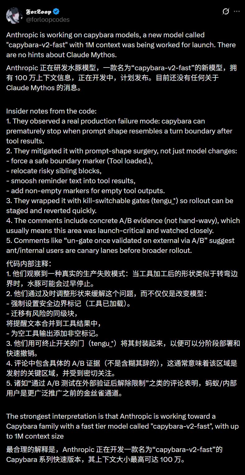 另外,昨天泄露的Claude Code源代码中,曝光了不少Anthropic「卡皮巴拉」模型的细节。