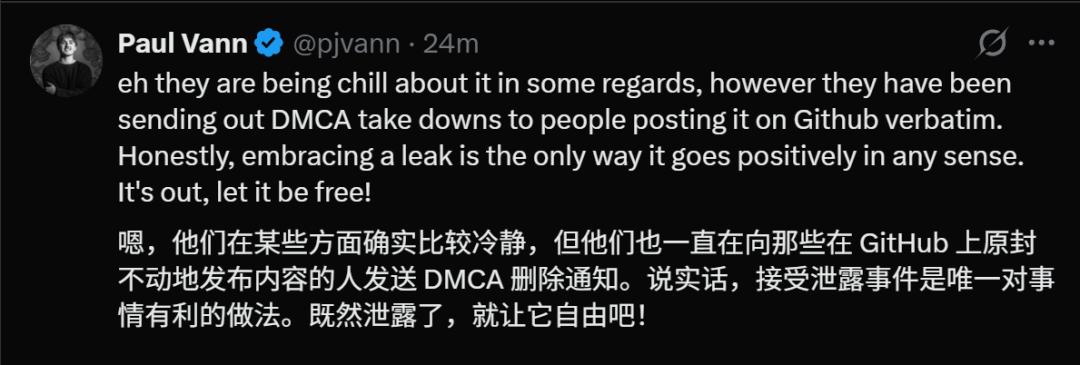 有意思的是,面对如此大规模源代码事件,Anthropic的态度倒是出奇的冷静,他们只是默默地私下向GitHub仓库发了DMCA(数字千年版权法)删除通知。