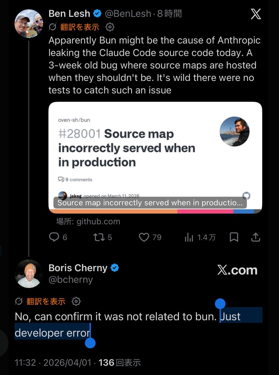 Claude Code之父Boris Cherny也否认了这是由于bun的问题,只是轻描淡写说了一句,「只是开发者的错误」。