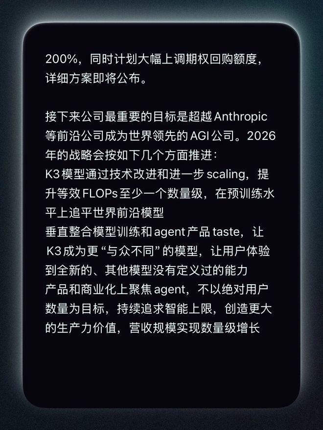 在去年最后一天,Kimi发的内部信里,杨植麟公开表示下一阶段要以“超越Anthropic 等前沿公司成为世界领先的AGI公司”——不是OpenAI,也不是Gemini或者Grok,而是以Anthropic作为了直接对标的代表。