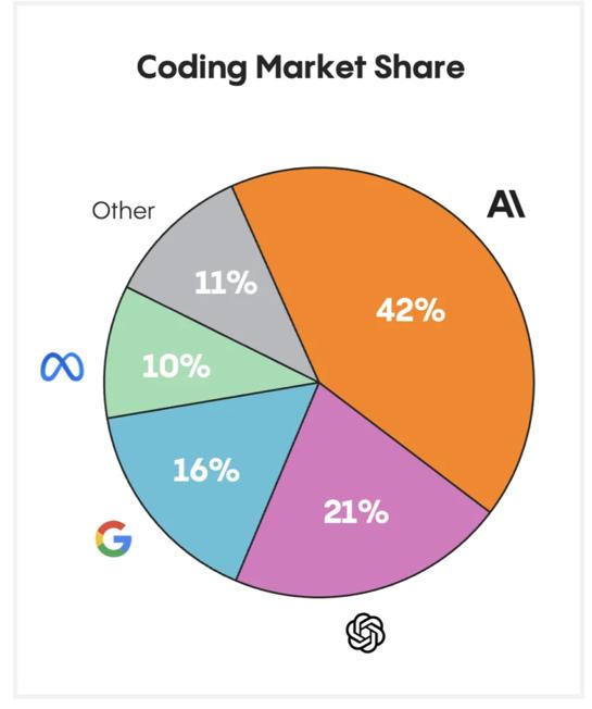 其中,在2025年中旬,Anthropic在Coding市场中的占有率高达42%,刚好是OpenAI的两倍。